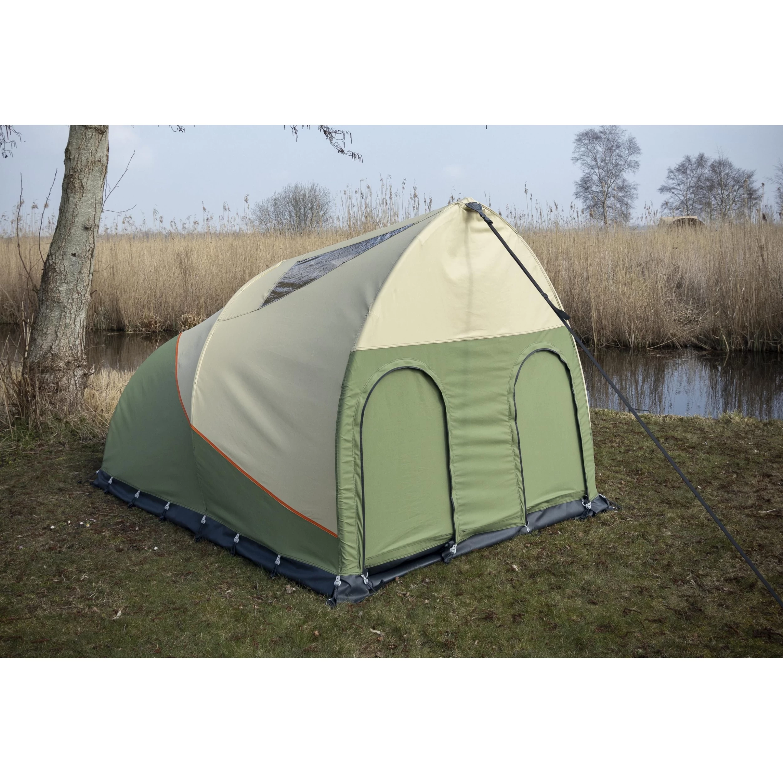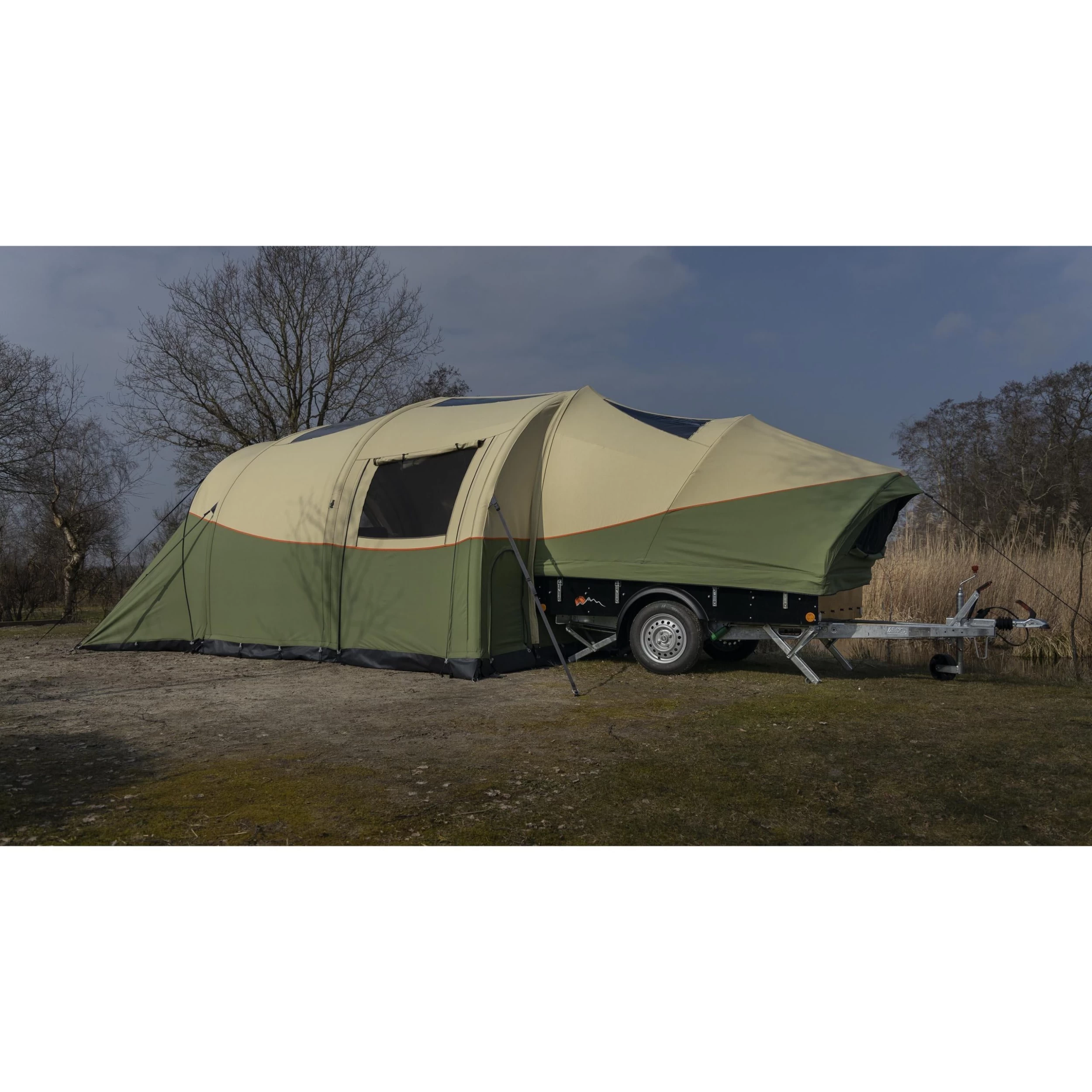 De Alpenkreuzer OpenAir vouwwagen is een ruime vouwwagen die met een voortent van 300 x 300 cm veel ruimte heeft en geschikt is gezelschappen van 2 tot 6 personen. Deze Alpenkreuzer vouwwagen is voorzien van een luifel van 74 cm. Het 100% katoenen tentdoek is waterafstotend, vocht afvoerend en ademend voor een comfortabele kampeerervaring. Het Hybride-Air/Alu frame is zeer stevig en beschikt over meerdere grote raampanelen. De tent laat hierdoor veel licht binnen en geeft een ruimtelijk gevoel. De vouwwagen is verder voorzien van een ruim bed van 150 x 210 cm met een 8 cm diep schuimmatras en lattenbodem, hiermee bent u zeker van een goede nachtrust.