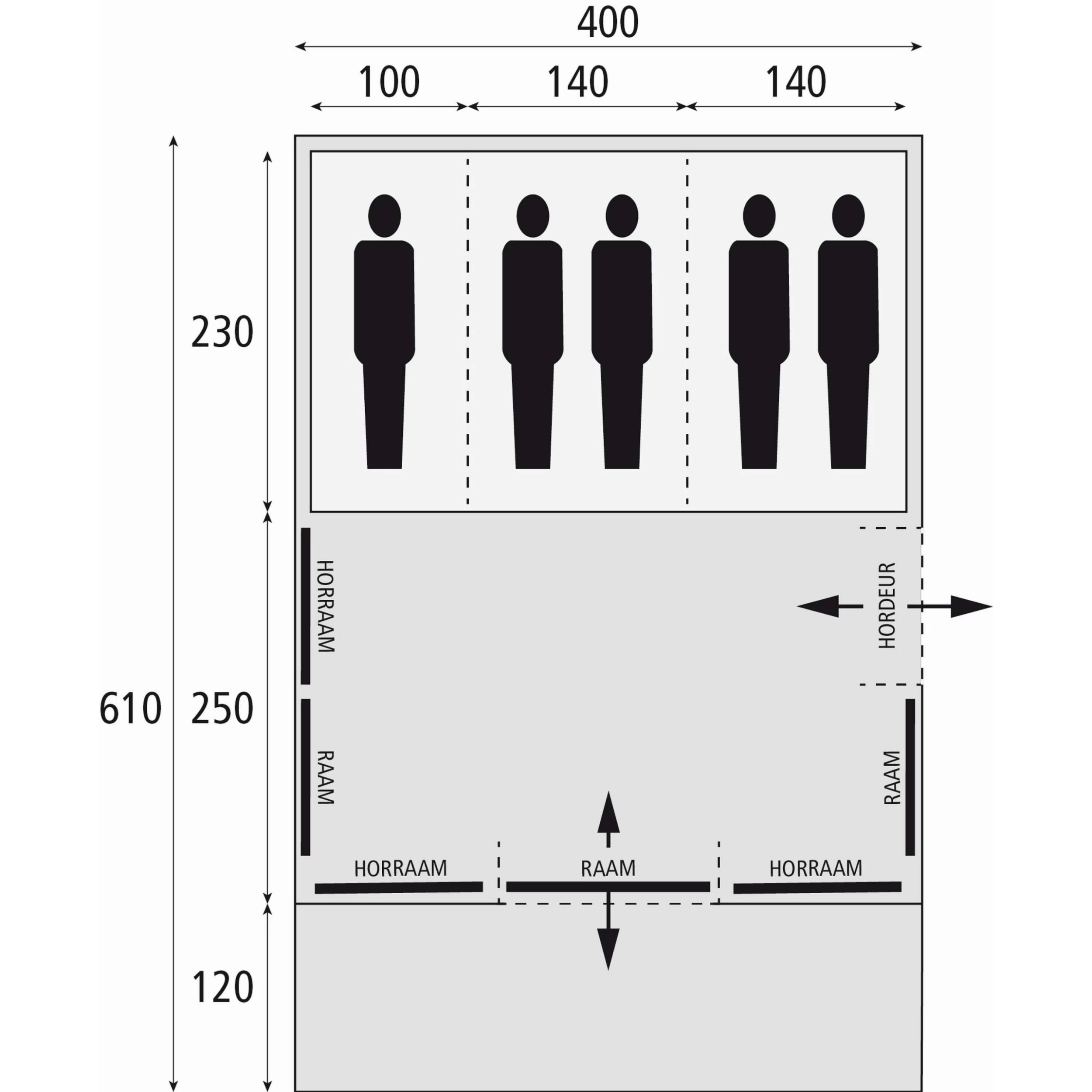 De Spitfire 400 XL RSTC tunneltent van Bardani is een royale familietent met stahoogte en een zij-ingang met een hordeur. De tent is beschikt over drie extra lange en donkere slaapcabines, waar ruimte is voor maximaal 5 personen.