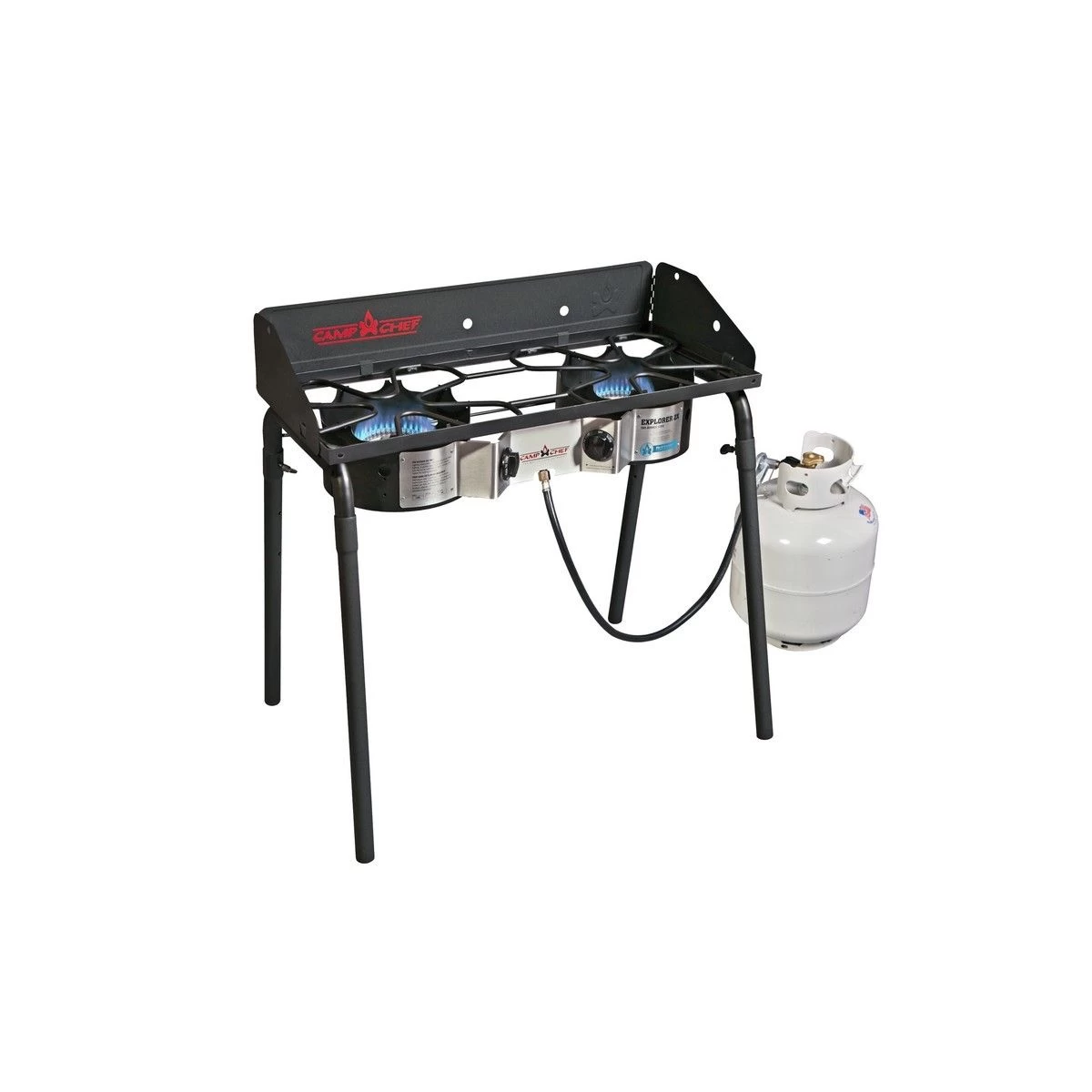 Het Camp Chef Explorer kooktoestel biedt voldoende ruimte om grote maaltijden klaar te maken. Het kooktoestel beschikt over twee 6,45kW gasbranders. De temperatuur is makkelijk te bepalen door middel van de knoppen aan de voorkant. Aan drie kanten zijn windschermen geplaatst en het onderstel is snel op te zetten voor gebruik. Op de vierkanten branders kunnen ook accessoires worden geplaatst als een grillplaat.