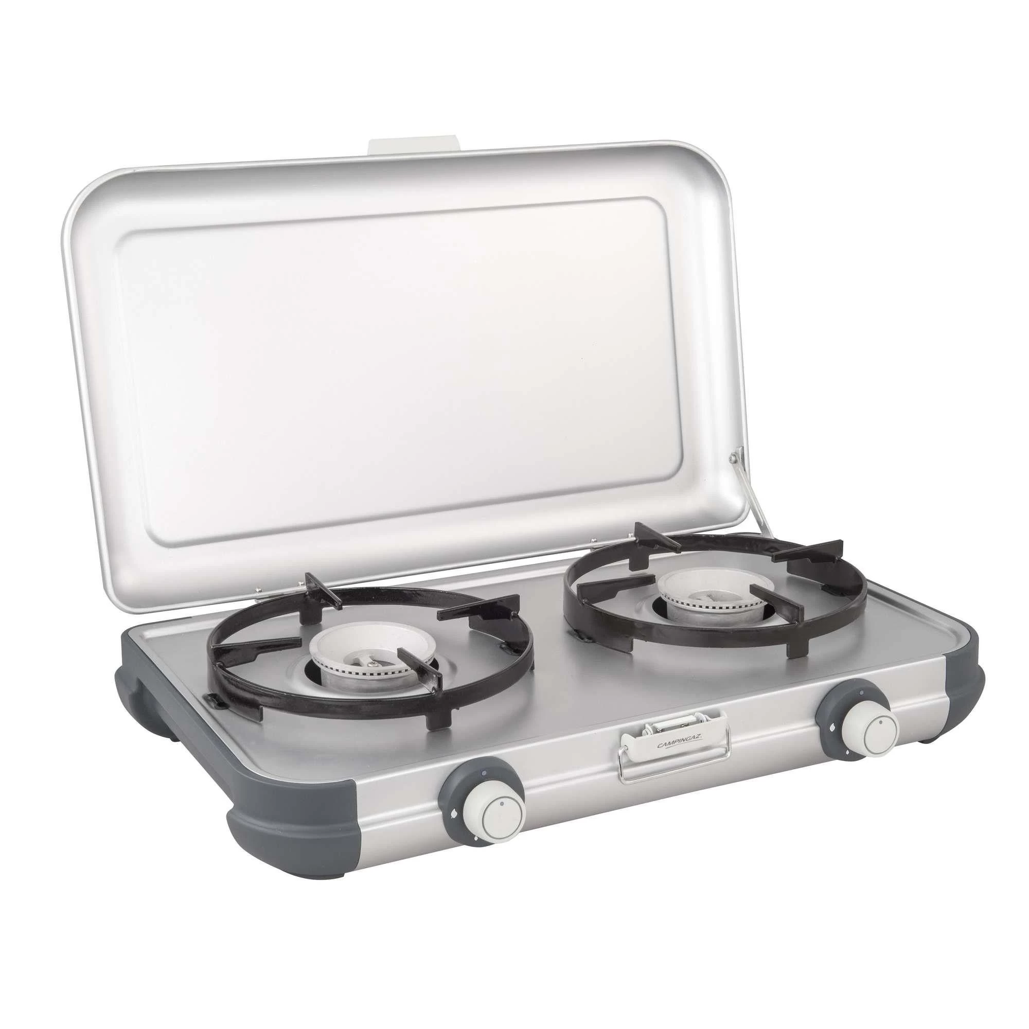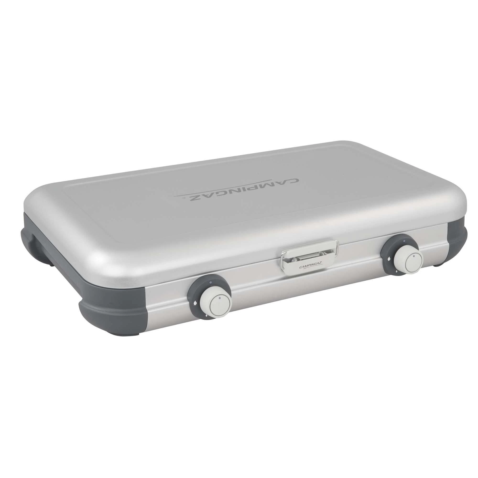 Het Campingaz Camping Kitchen 2 CV kooktoestel is geschikt voor weekendjes weg, uitstapjes of vakanties. Het kooktoestel is licht, draagbaar en heeft twee pitten. Het platte model is ruimtebesparend. Het kooktoestel heeft een robuuste stalen deksel en hittebestendige zijpanelen. Deze zijpanelen van geëmailleerd staal zijn vaatwasserbestendig en bieden daarnaast bescherming tegen wind. Het toestel is geschikt voor twee pannen met een diameter van 24 centimeter. De Easy Clic PLUS aansluiting zorgt ervoor dat patronen gemakkelijk geplaatst en verwijderd kunnen worden.