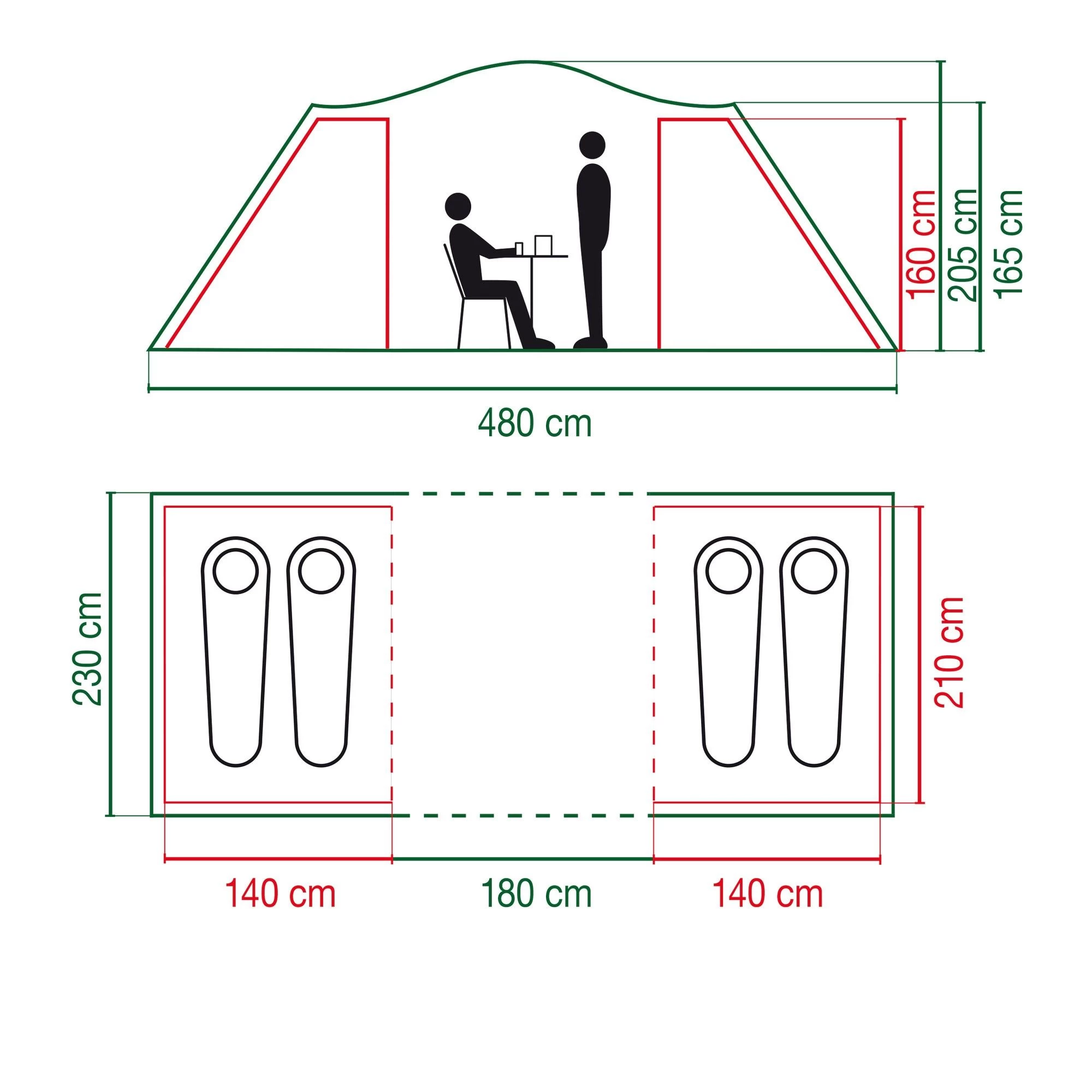 Deze tent heeft twee slaapcabines tegenover elkaar. Beide zijn geschikt voor 2 personen. Het leefgedeelte bevindt zich in het midden en heeft aan de zijkant een deur waardoor de tent goed geventileerd kan worden en er veel licht binnenvalt. Voor extra comfort is een horraam in de deur van de binnentent geplaatst. In het leefgedeelte kan het inhaakbare grondzeil eenvoudig worden bevestigd. Het grondzeil heeft hoge zijpanelen waardoor de tent goed beschermd is tegen zware regenbuien.