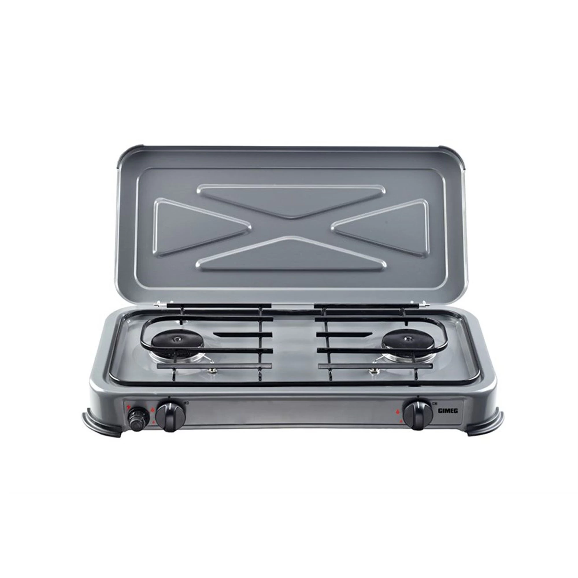 Dit grijze 2-pits kooktoestel van Gimeg heeft 2 krachtige 2,2 kilowatt branders voor een maximaal vermogen. Dankzij de ingebouwde elektrische ontsteking is dit kooktoestel simpel en veilig te ontsteken. Dit product heeft antislip voeten, wat voor extra stabiliteit en veiligheid zorgt. Het kooktoestel beschikt over een deksel om het product na gebruik af te sluiten. Deze kan ook dienen als windscherm voor tijdens het koken. De pannendragers zijn afneembaar en de onderdelen zijn geëmailleerd.