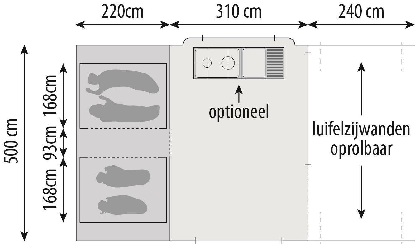 Om lekker in de schaduw te kunnen zitten of te schuilen voor regen, heeft de vouwwagen een royaal vast luifel van bijna 2,5 meter diep. De zijwanden zijn oprolbaar en hebben afsluitbare ramen. Verder heeft de Sunrider een symmetrisch uitklapsysteem, waardoor u deze gemakkelijk en snel kunt op- en afbouwen. Ideaal wanneer het regent. Verder biedt de vouwwagen goede ventilatiemogelijkheden. U kunt trouwens ook alleen de wagentent opzetten. Super handig wanneer u ergens maar één nacht verblijft. Dat maakt de Sunrider ideaal voor een reis met meerdere tussenstops.