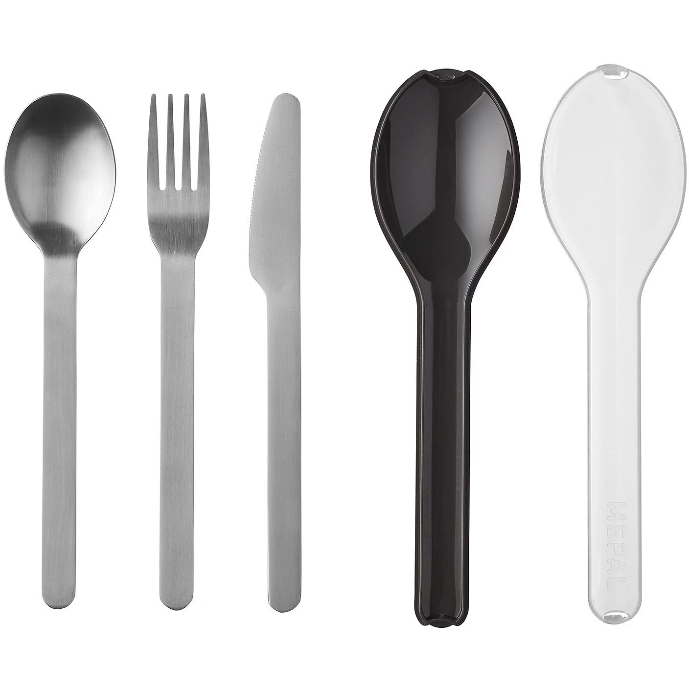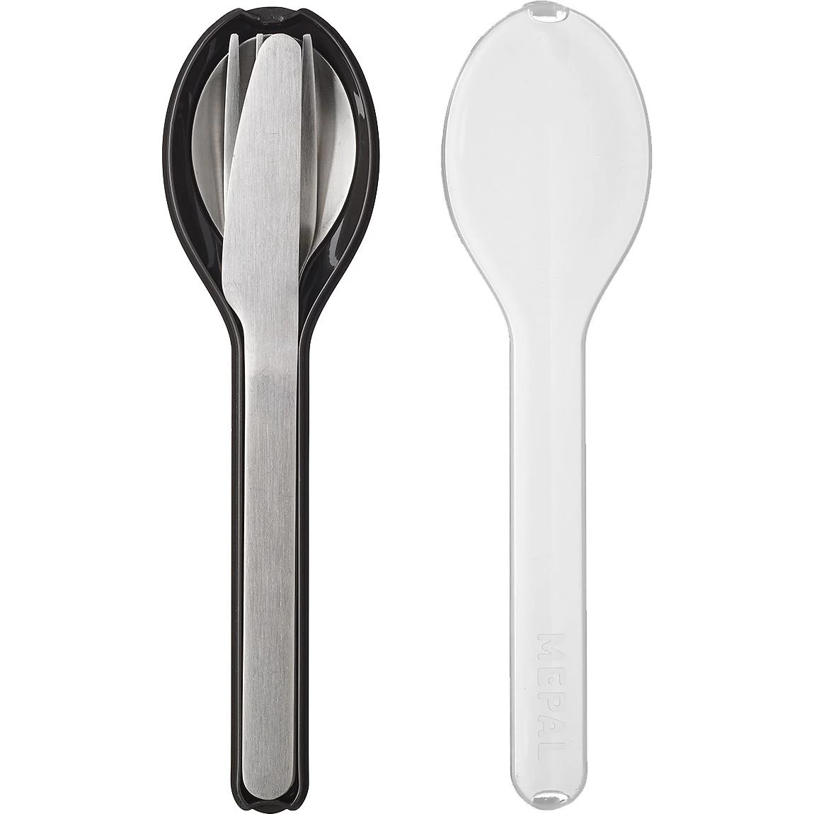 Het Mepal Ellipse bestekset bestaat uit een vork, mes en lepel en deze worden schoon gehouden door de kunststof houder. Dit bestek mag in de vaatwasser en is handig om mee te nemen overal naartoe.