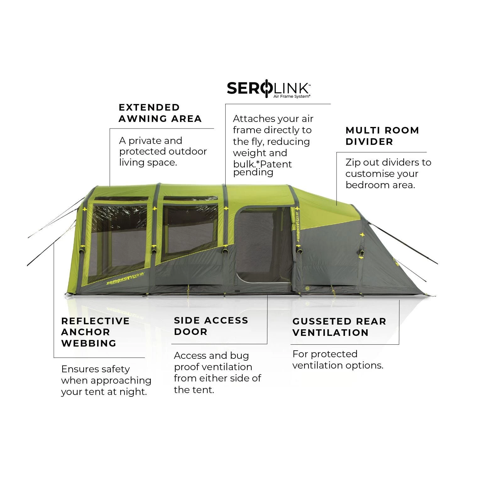 De Zempire Camping Evo TL V 2 opblaasbare tunneltent is royaal uitgevoerd en voorzien van veel (permanente) ventilatiemogelijkheden. De grote ramen, ook in het dak, zorgen voor veel lichtinval in de tent. Er zijn ook twee zij ingangen die ook zijn voorzien zijn van horrengaas; ideaal om te ventileren.
